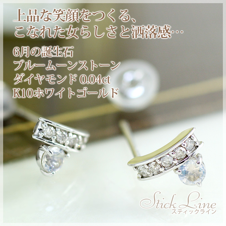 【製造品】ムーンストーン ピアス ラウンドカット 3mm & ダイヤモンド 0.04ct スタッドピアス K10ホワイトゴールド(K10WG) 6月誕生石 「スティックライン」/製造オーダー品 約20日間納期