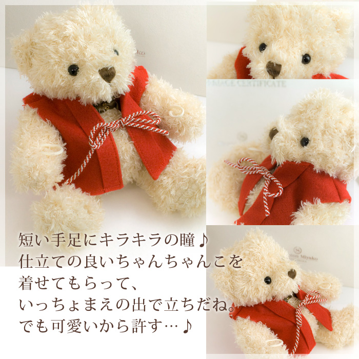 このように、ジュエリーケースをハグした状態でのお届けとなります。ジュエリーケースはリボンで仮固定していますので、お届け後はクマちゃんと別々に保管してください。 ちゃんちゃんこを着たクマちゃん、