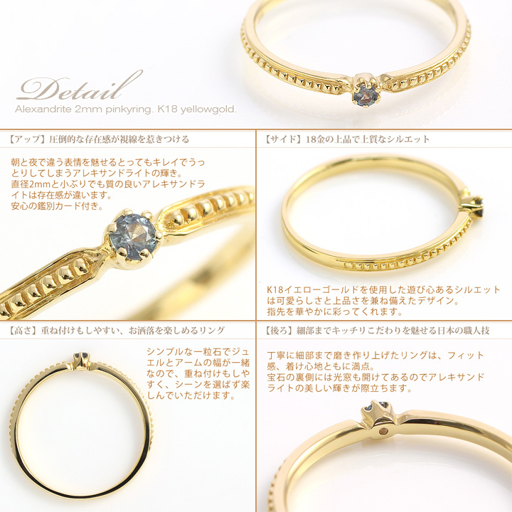 アレキサンドライト リング 指輪 レディース K10/K18イエローゴールド 18金 18k 2mm ラウンドカット ピンキーリング対応 鑑別カード付き 6月誕生石 リングサイズ 0号 1号 2号 3号 4号 5号 6号から17号「ロシオ」/製造オーダー品 約20日間納期